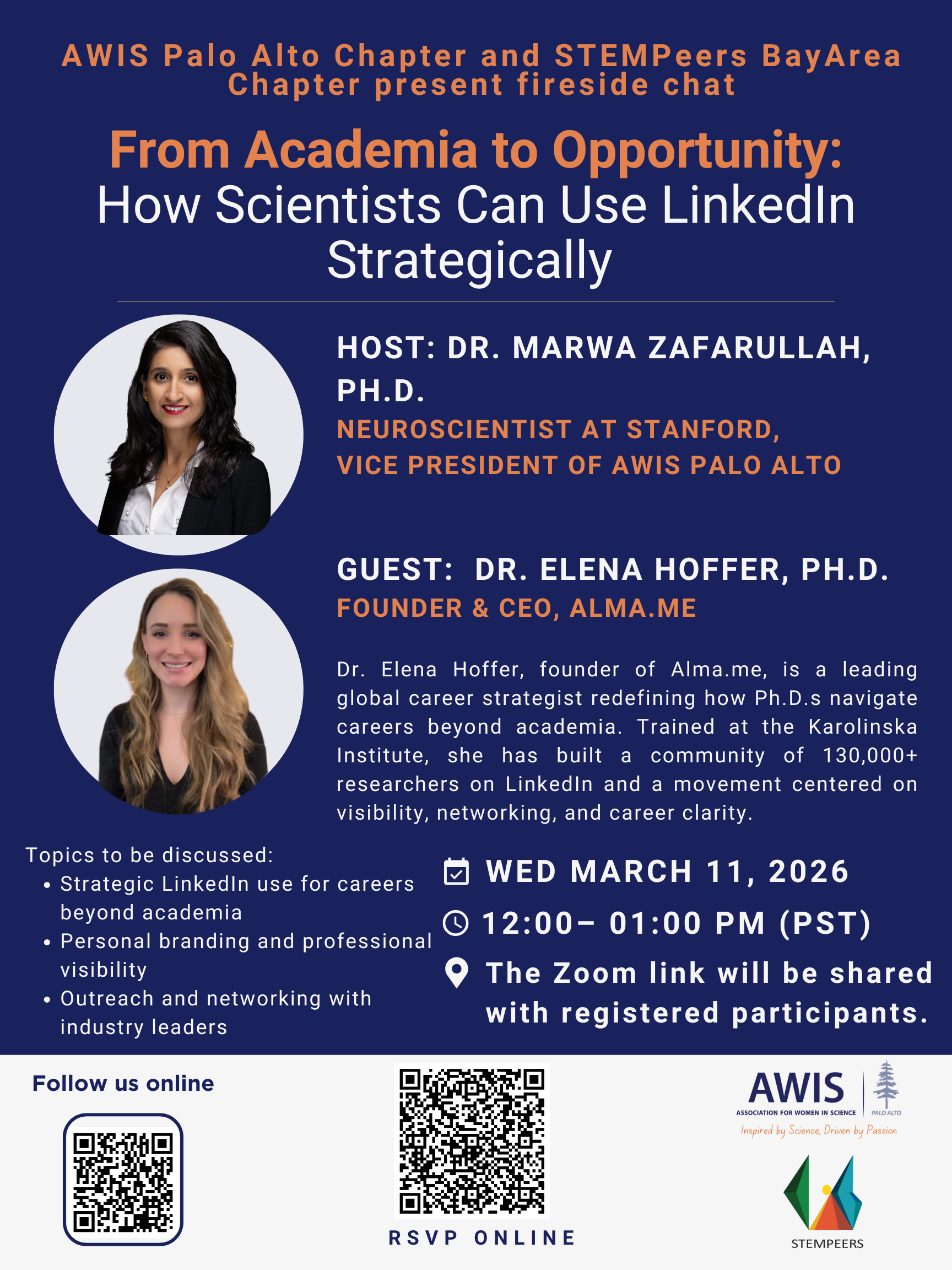 Host: Dr. Marwa Zafarullah, Ph.D. (Neuroscientist, Stanford University, and Vice President of AWIS Palo Alto)